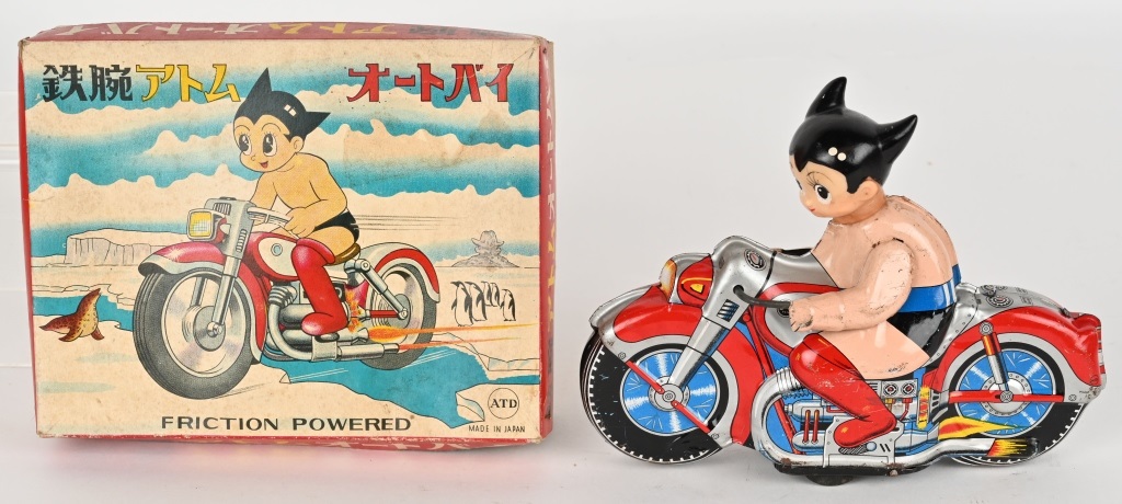 When something exotic appears in a toy auction, the sky can be the limit. Such was the case when a rare Asakusa 8-inch tin friction Mighty Atom (Astroboy) Motorcycle crossed the auction block. In all original condition, with a clean vinyl head, this appealing toy was destined to land a premium price, in part, because of its colorful, Japanese language box. On its lid is a graphic of the Mighty Atom (Astroboy) riding his motorcycle – shirtless and in shorts – across an Arctic landscape as a seal and five penguins look on from the distance. Entered with a $3,000-$5,000 estimate, it was bid aggressively to $25,830.