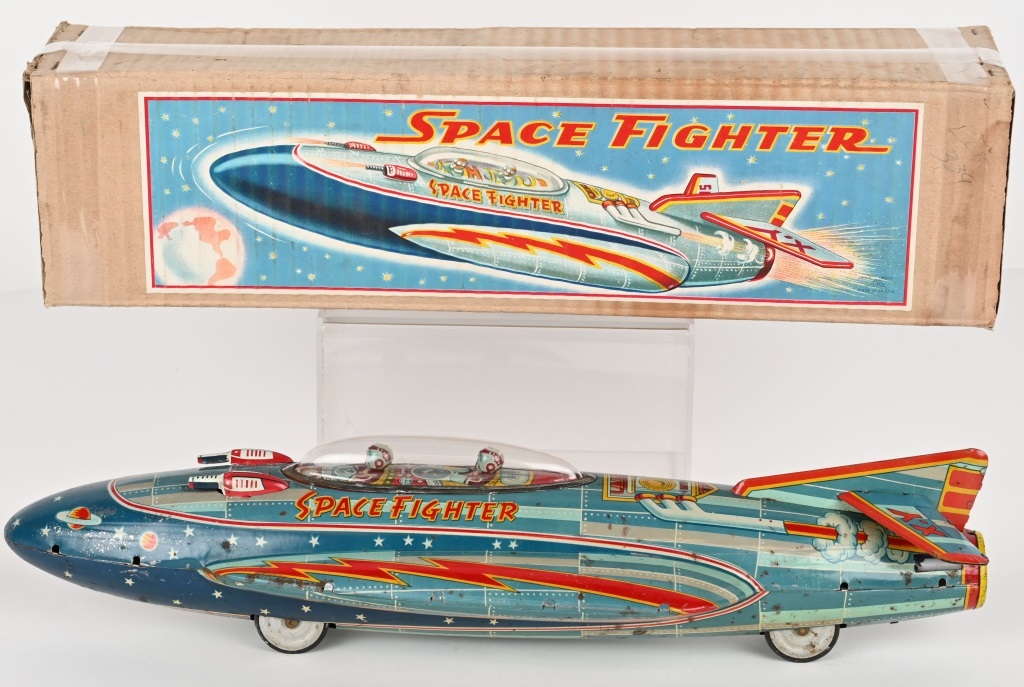 Following closely in the list of top 10 auction winners was a K Okada 19-inch-long tin friction XY-105 Space Fighter. All original and complete, including its guns and canopy above two correct spacemen drivers, it also retained its original paper label box. One of the best and most original examples of its type that Milestone’s specialists had ever seen, it rocketed to $25,800 against an estimate of $10,000-$15,000.