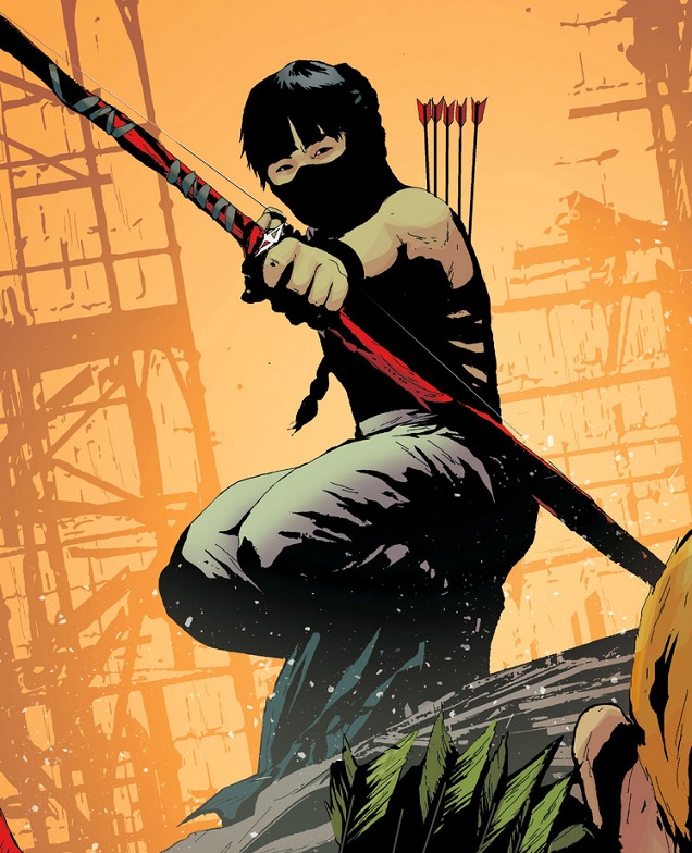 Emiko was created by Jeff Lemire and Andrea Sorrentino as the daughter of Robert Queen (Ollie’s dad) and archer/assassin Shado. Emiko was kept secret from the paternal side of her family and was kidnapped by Komodo when she was an infant. He then raised her as his own and trained her to become an assassin. She met her brother, though didn’t know it at the time, while protecting Komodo.