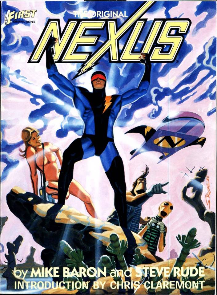 The Original Nexus (First Comics Graphic Novel #4) reprinted the three issues of the magazine-format B&W first volume of the series that debuted at Capital Comics before moving to First Comics with Volume 2 #7.