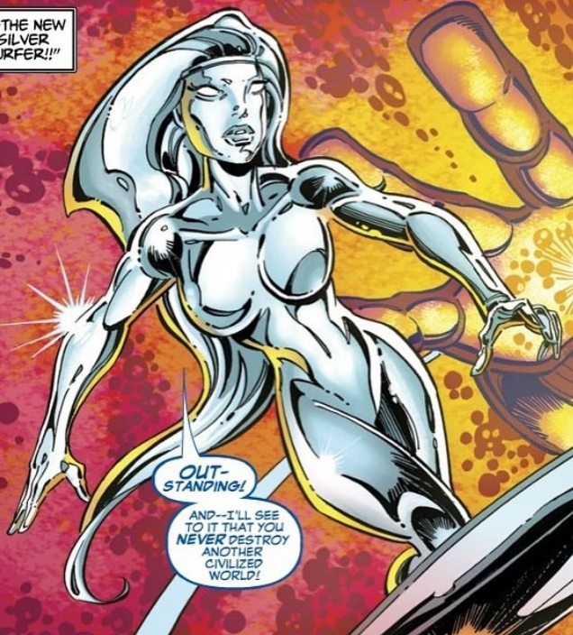 Later after she was resurrected, Shalla-Bal became Zenn-La’s Keeper of the Great Truth and started a mission to share the perfection of her planet throughout the universe via the Illuminatrix. When she came to Earth to convert it, Silver Surfer refused to join her, so she put some of Earth’s heroes under her thrall and made them fight Surfer. To stop the conversion from happening, Silver Surfer used the Power Cosmic to destroy the Illuminatrix which destroyed Zenn-La. In retaliation, Shalla-Bal made Surfer forget that he was a Zenn-Lavian and then she and her armada left Earth.