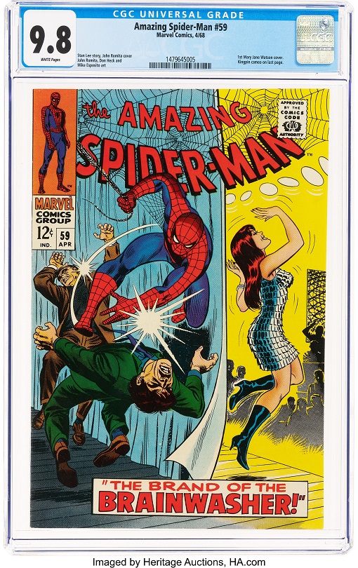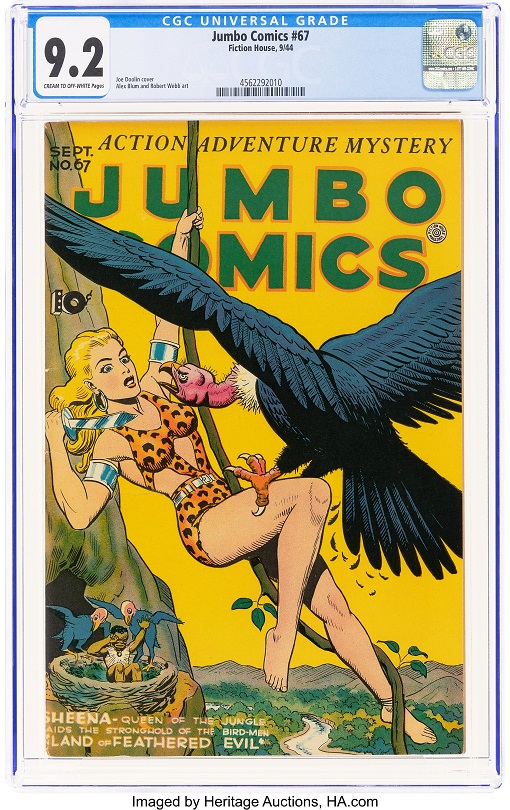 In the comic auction, Heritage has a CGC census topping copy of The Amazing Spider-Man #59 CGC 9.8 with Mary Jane Watson’s first cover appearance. Jumbo Comics #67 CGC 9.2 is the highest graded copy, featuring a Joe Doolin cover of Sheena, Queen of the Jungle battling a vulture.