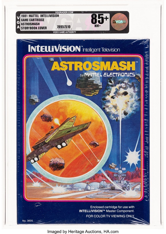 The video games auction is led by Astrosmash VGA 85+ for Intellivision which combines elements of Space Invaders and Asteroids as players use laser cannons to destroy meteors, bombs, and alien ships. The Super Mario 3D Collection CGC 9.8 sealed for Nintendo Switch was a limited time release containing Super Mario 64, Super Mario Sunshine, and Super Mario Galaxy.