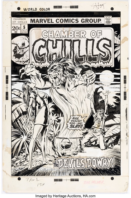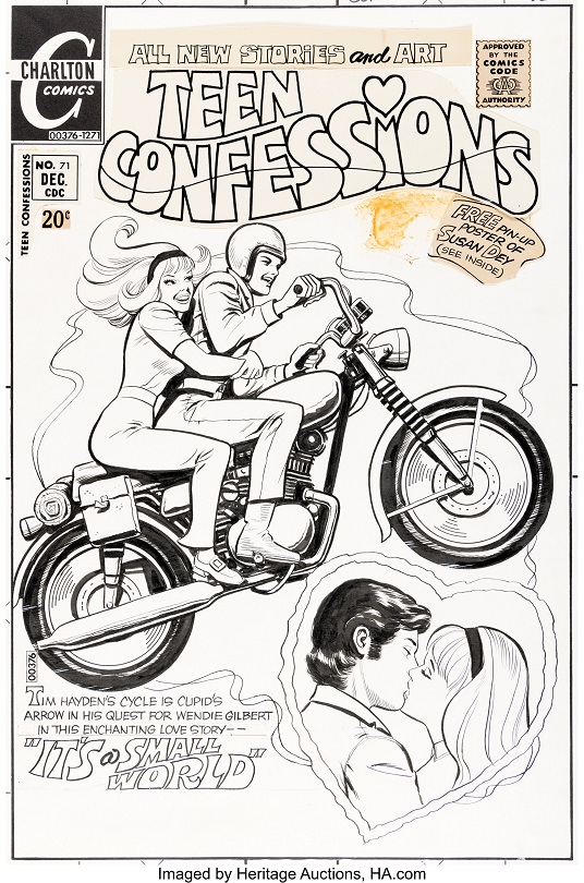 The original art auction features Rich Buckler and Tom Palmer’s Chamber of Chills #5 cover showing a creature bursting through flames as the sorcerer Orizaba commands it to rise. Art Cappello’s Teen Confessions #71 cover takes inspiration from Evel Knievel with teen daredevils ramping a motorcycle.