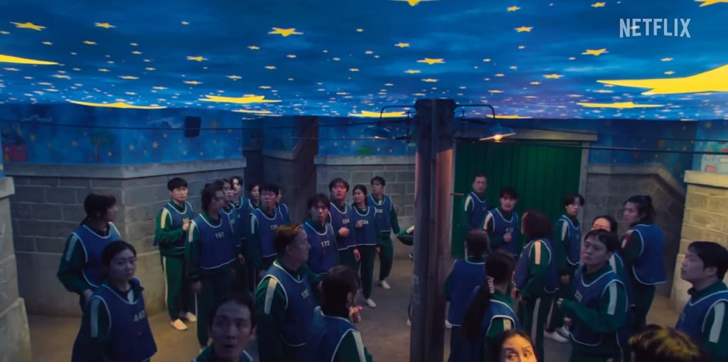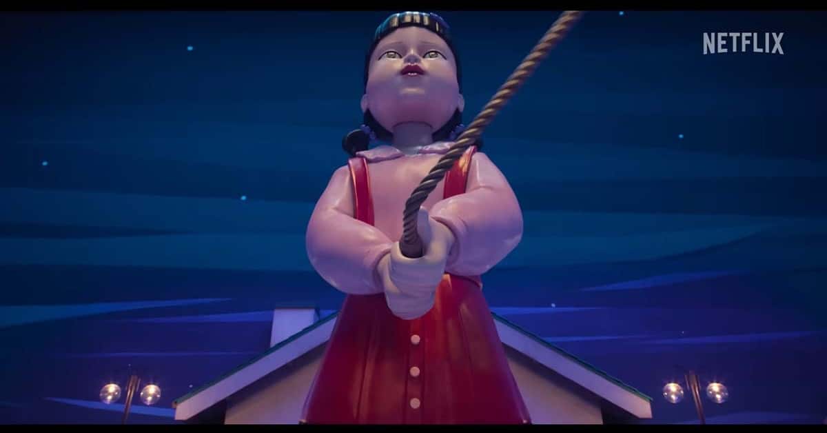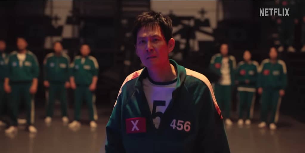 The trailer begins with the surviving players walking into their latest nightmare, er… game. Gi-hun/Player 456 (Lee Jung-jae) questions the guards as to why he was spared when he led the group of attackers who tried to take over the facility. Players are taken in groups into what could be a maze, other shots show players ready to fight one on one that includes an image of Hyun-ju/Player 120 (Park Sung-hoon) with blood on her face. It teases that players are still voting on whether or not they should remain in the game, and the giant creepy little girl statue from Red Light, Green Light is seen swinging one half of a jump rope over a narrow bridge.