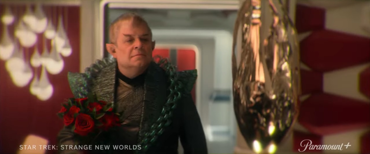 There’s a romantic interlude between Spock and Christine Chapel (Jess Bush), Patton Oswalt as a Vulcan, and a murder mystery party with the crew. We see Pelia (Carol Kane) rewiring things on the ship, quick shots of the action to come, and Scotty gets a toast from Kirk when he joins the Enterprise.