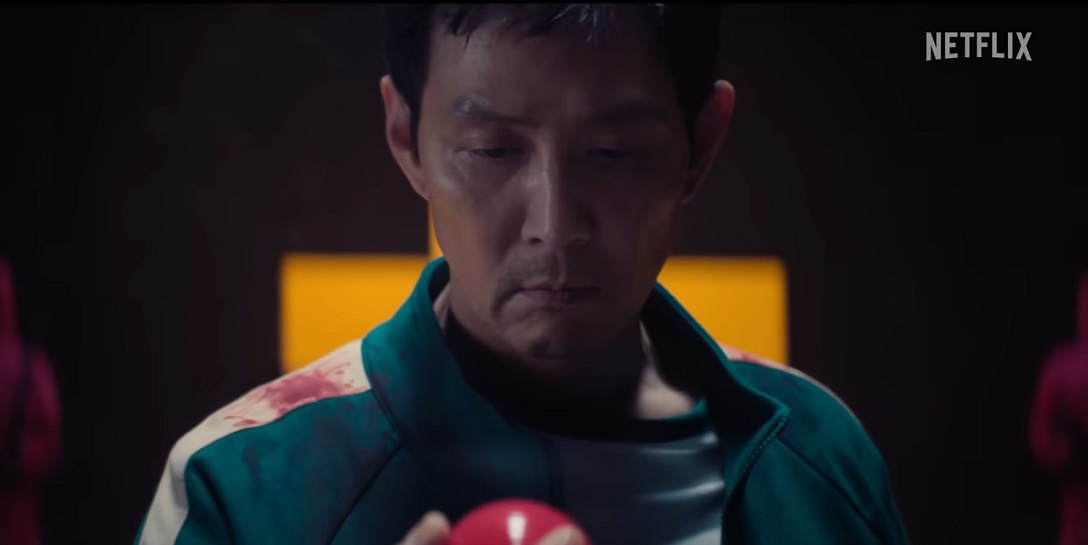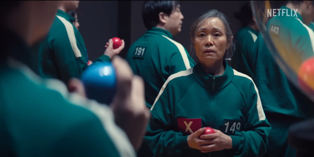 Seong Gi-hun/Player 456 (Lee Jung-jae) is brought into the sleeping quarters in a coffin shaped box with a pink bow on top. We learn that an upcoming game has something to do with blue and pink balls, with mother Geum-ja/Player 149 (Kang Ae-sim) and son Yong-sik/Player 007 (Yang Dong-geun) shown with opposite colors, suggesting that they won’t be on the same team.