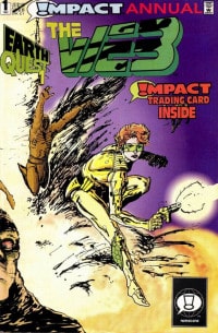 This issue includes an exclusive bound-in Impact Comics trading card, a part of a set of 18