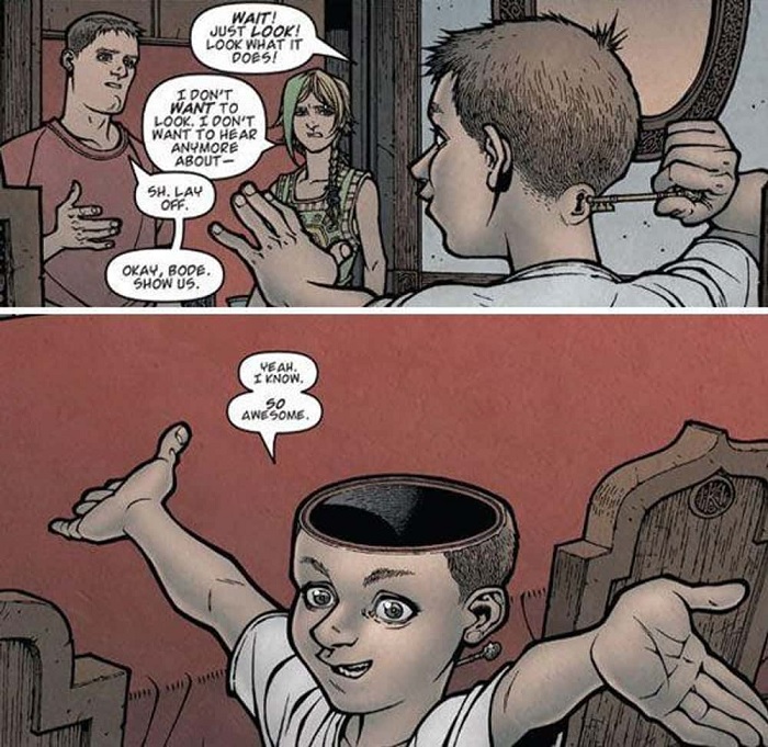 Throughout the comic series, Hill and Rodríguez introduced dozens of keys with varying levels of power. The Alpha Key pulls demons out of possessed people when inserted in their chest. The Head Key can be inserted into someone’s head and lets the user see inside their mind. The Identity Key can change a person’s appearance when inserted under their chin. The Anywhere Key opens a door to wherever the user can picture, and the Mirror Key opens a door to a pocket universe when place in a mirror.