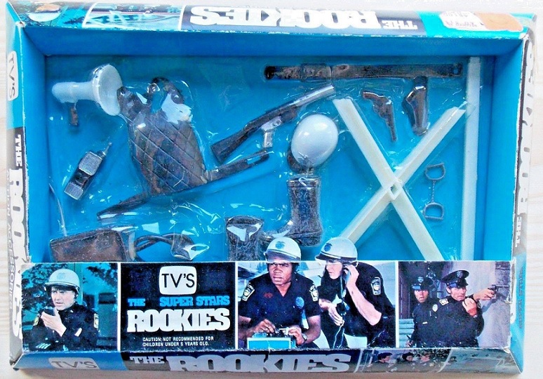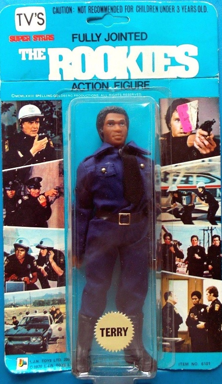 The Rookies inspired a line of LJN 8” action figures based on Danko, Webster, Gillis, Owens, and Ryker that were released while the show was on the air. They came in three body types that featured different options for movement. One had biceps that swiveled with pin-jointed wrists and ankles (that could move forward and backward), one had ball joints in the wrists (that could move in a circular motion) and pin joints in the ankles, and the other had ball joints in the wrists and ankles. They came fully dressed for work in uniform with a tie, belt, and work boots.