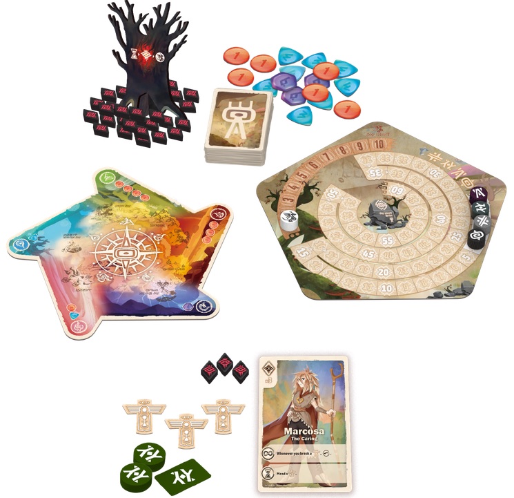 The expansion includes Summoner titles for asymmetric starts and ongoing abilities, new Curse tokens that must be removed before the end of the game to avoid loss of points, and a Cursed Tree Standee that accompanies the Curse tokens.