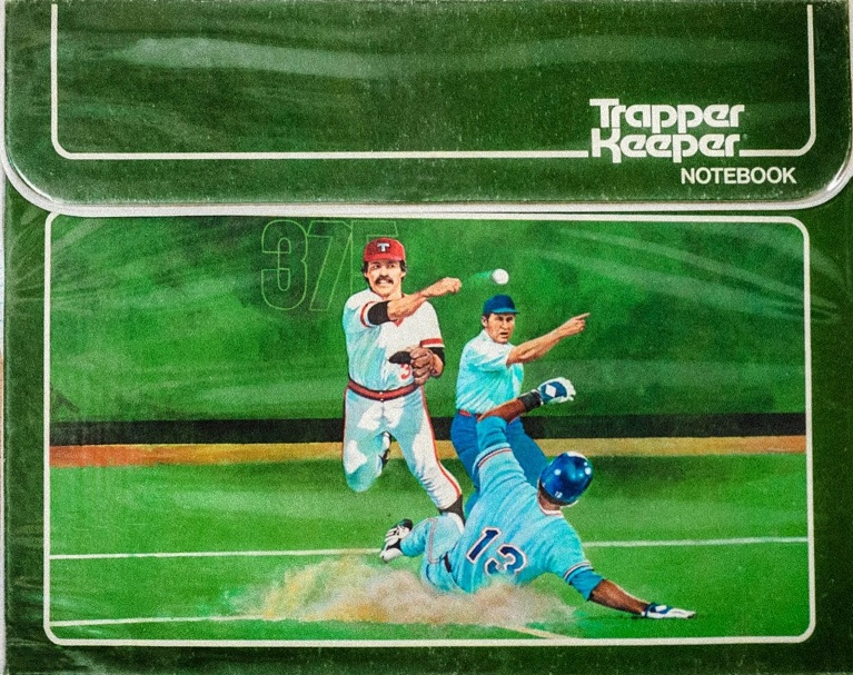 The Trapper Keeper is a loose-leaf binder with plastic rings in the center that secure papers and folders. It has pockets on the inside of the binder and a wraparound flap that keeps it closed with Velcro. The style part came in the design on the front and back covers of the binder. By the late 1980s, Trapper Keepers featured bright colored patterns, pictures of sports figures or cute animals, and licensed images of characters from TV shows, movies, comics, and video games.