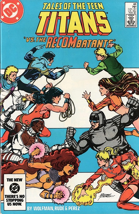 In the pages of Tales of the Teen Titans #48, Wolfman and Rude introduced “RECOMbatants,” characters that were clearly modeled on the DNAgents. For his part, Meugniot transformed the members of the Titans into the pastiche super-team codenamed “Project Youngblood” in DNAgents #14.