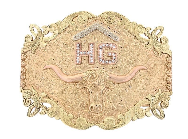 An Ahmad Khan belt buckle brings the bling with a buckaroo twist in a dazzling combination of 14K gold, diamonds and intricate embellishments that reflect a superior level of artistry. The piece was custom-made by Khan – a silver and goldsmith whose designs have been worn by scores of A-list stars – for renowned Miami Beach judge and passionate Bohlin collector Howie Gross. The initials “H.G.” are set on the buckle in diamonds, below a repousse image of a Texas longhorn steer. It is further adorned with a stylized scroll-pattern border and raised Bohlin-style spots on the outer perimeters. On verso, it displays the maker-mark of Khan, a Bohlin disciple and master engraver in his own right. Estimate: $20,000-$25,000