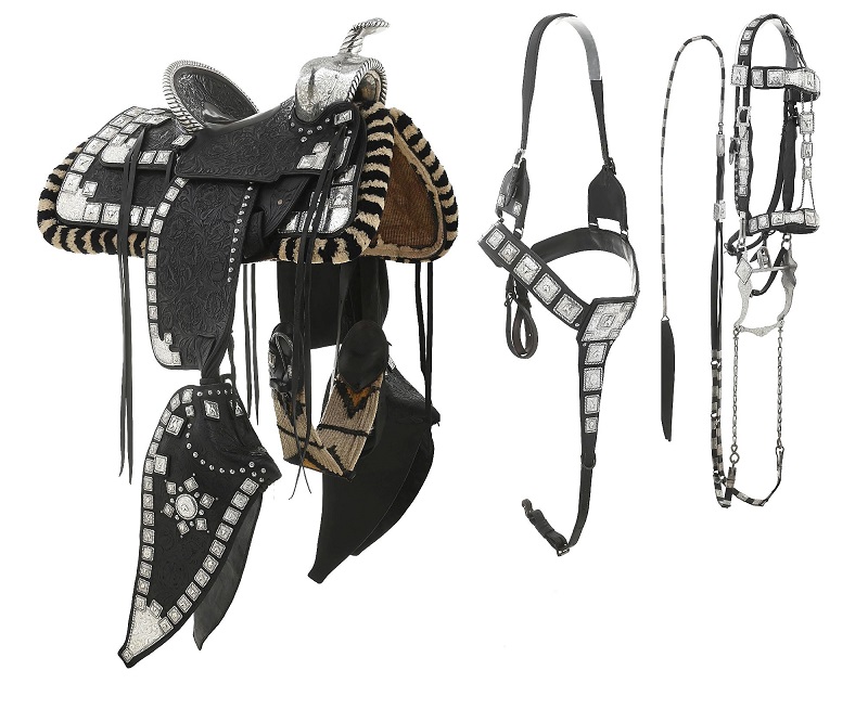 The Hollywood highlights continue with an impressive Edward H. Bohlin “San Gabriel” sterling silver-mounted Hollywood parade saddle. It was constructed with a fully silvered front and rope-edged cantle, built on a Miles City 15-inch tree. The show-stopping saddle is lavishly adorned with square figural rope-edged conchos featuring steer heads, buffalos, horse heads and American eagles. It is part of an ensemble that includes a fully matching Bohlin-made bridle and bit with split reins and a romal adorned with engraved flat ferrules, as well as a matching breast collar. The cantle plate is customized Lane Ranch / Lancaster Calif, with gold brands. In overall fine condition, it comes with a black and white wool corona. Estimate: $35,000-$55,000