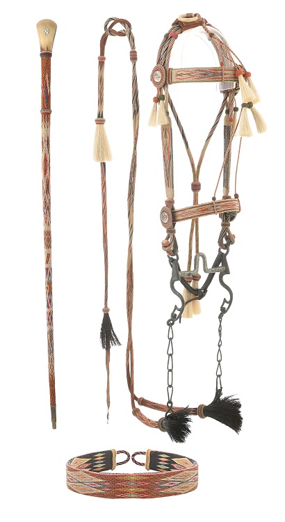 Prison-made bridles and accessories are extremely popular with collectors of Western artifacts, but it’s uncommon to encounter several items believed to have been created by the same inmate in a single auction lot. Morphy’s will present just such a grouping, comprised of a hitched horsehair bridle, hatband and cane, with similarities suggesting all three items were crafted by the same prisoner at Walla Walla, Washington state penitentiary. An exceptionally beautiful bridle in very fine condition, it has candy cane striping and diamond-design flat elements to the brow, nose and cheeks. It is covered in glass conchos, all retaining excellent colors; and the leather connectors and celluloid rings show little, if any, prior use. The second item is an unused hatband, or possibly a cowgirl’s (youth) belt, with colors and a diamond pattern that match the bridle. The cane was also worked in the same bright colors and includes a pair of American Flags in its motif. The horn handle is inlaid with abalone. Group estimate: $15,000-$18,000