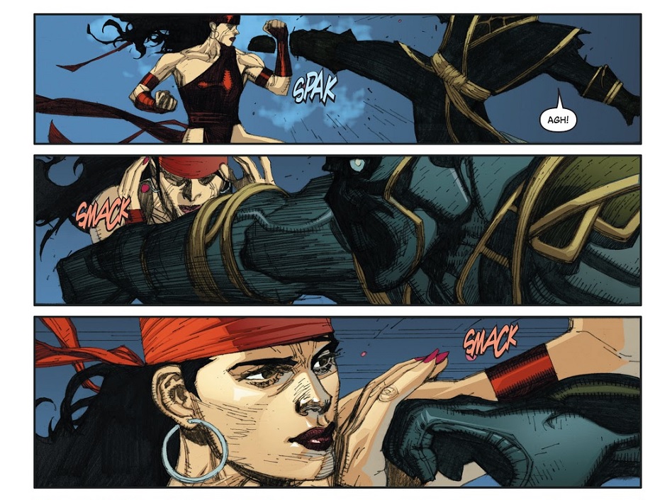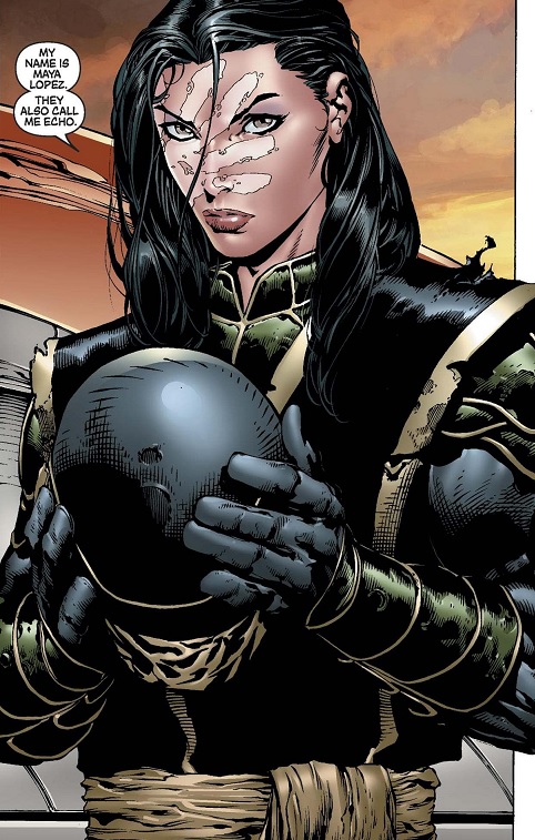 Maya Lopez, aka Echo, is a very talented woman with amazing athletic abilities, martial arts and acrobatic skills, photographic reflexes, as well as being a concert level pianist and ballet dancer. A creation of writer David Mack and artist Joe Quesada, Maya was introduced in Daredevil #9 (December 1999). She is a member of the Cheyenne people, and one of the few deaf comic characters.