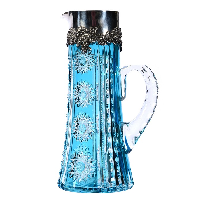 The third is an ABCG turquoise cut to clear tankard with a sterling collar and alternating panels of hobstar and prism, 11 inches tall. The elaborate embossed acorn sterling silver spout is marked Bigelow Kennard & Company. The color is unique and outstanding and the tankard, on a ray cut base, carries an estimate of $7,500-$10,000.